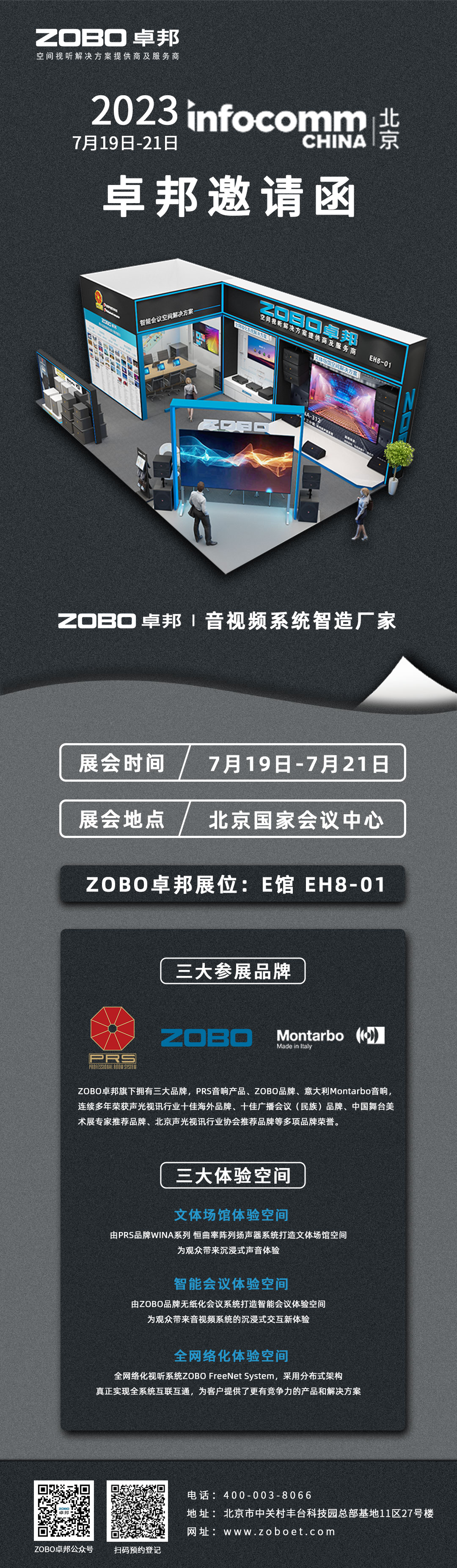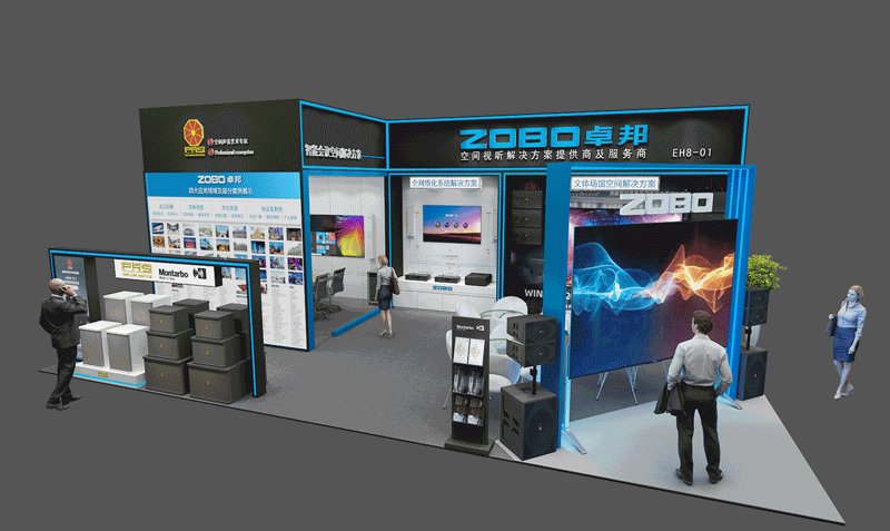 本次ZOBO卓邦展位(E馆EH8-01),分为文体场馆空间、智能会议空间、全网络化空间。在这里,您将一览拥有前沿技术的多款音视频产品和完善的空间视听解决方案。